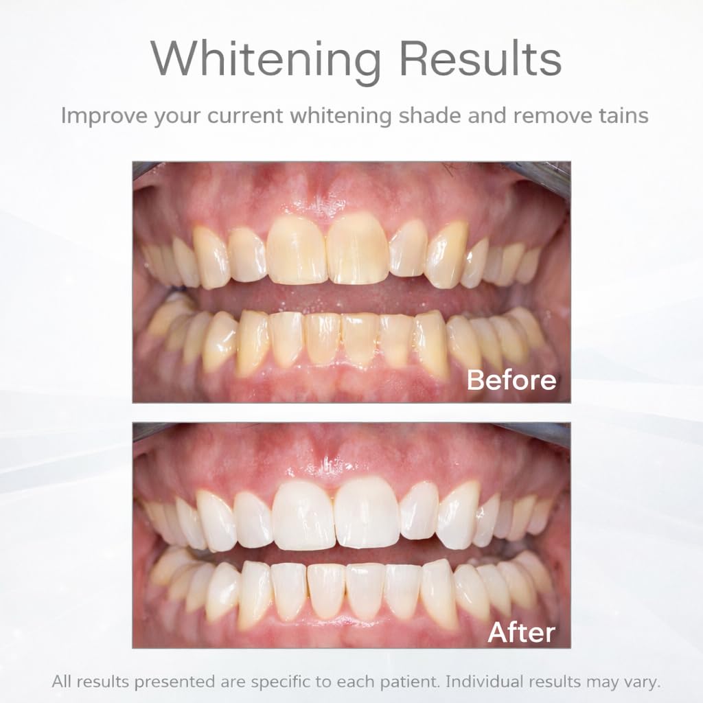 - 10% LOW SENSITIVITY TEETH WHITENING KIT: Whitens teeth chemically using Hydrogen Peroxide Gel with prefilled trays for efficient tooth whitening and ease of use. The trays include gel strips inside. Works on discolored teeth. Wearing time 30 to 60 minutes.
