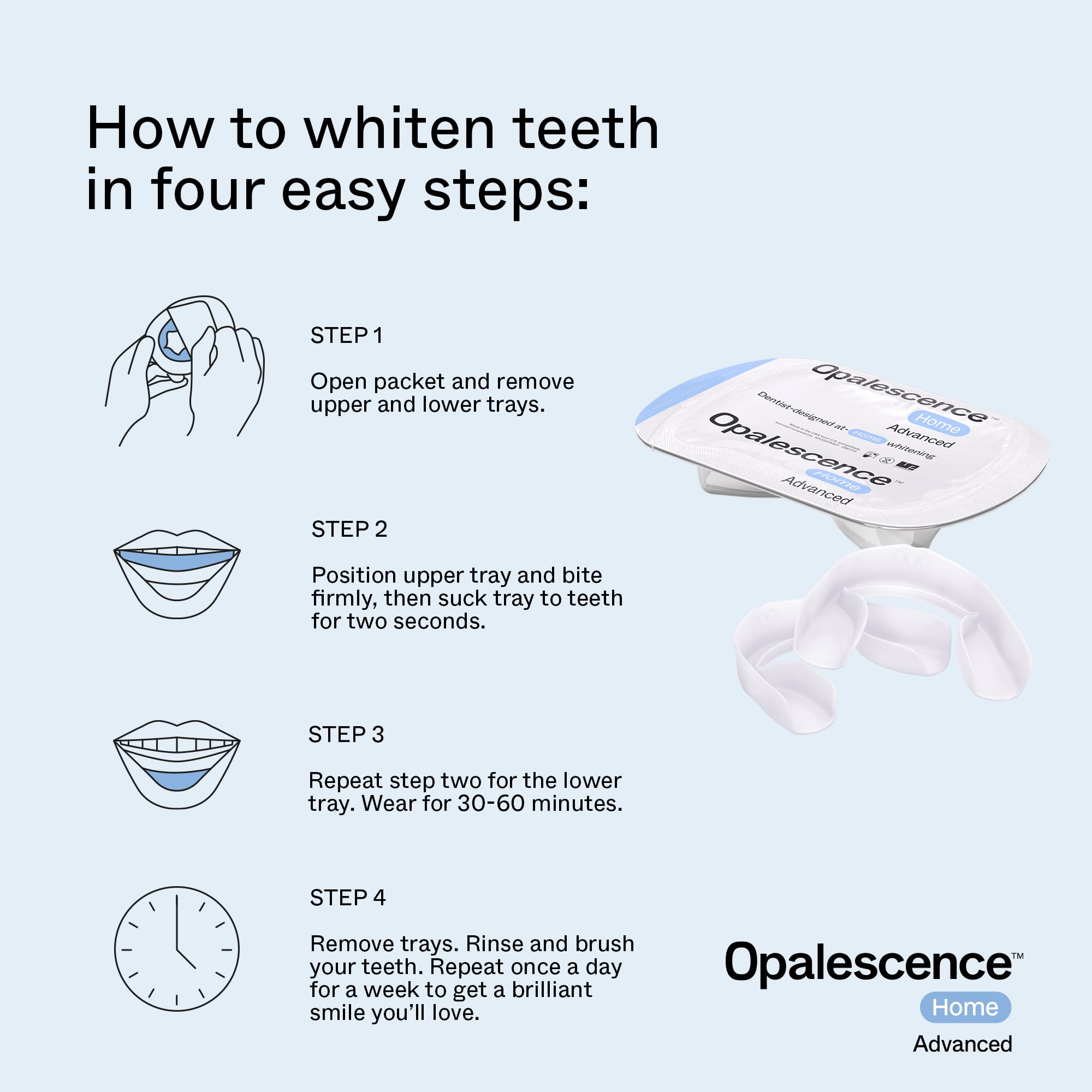 - DENTIST-DESIGNED WHITENING TRAYS 10%: Created by dental experts, Opalescence Home Advance features Opalescence teeth whitening gel prefilled trays designed for safe and effective teeth whitening no dental visit needed. Seriously works to deliver a brilliant smile.
